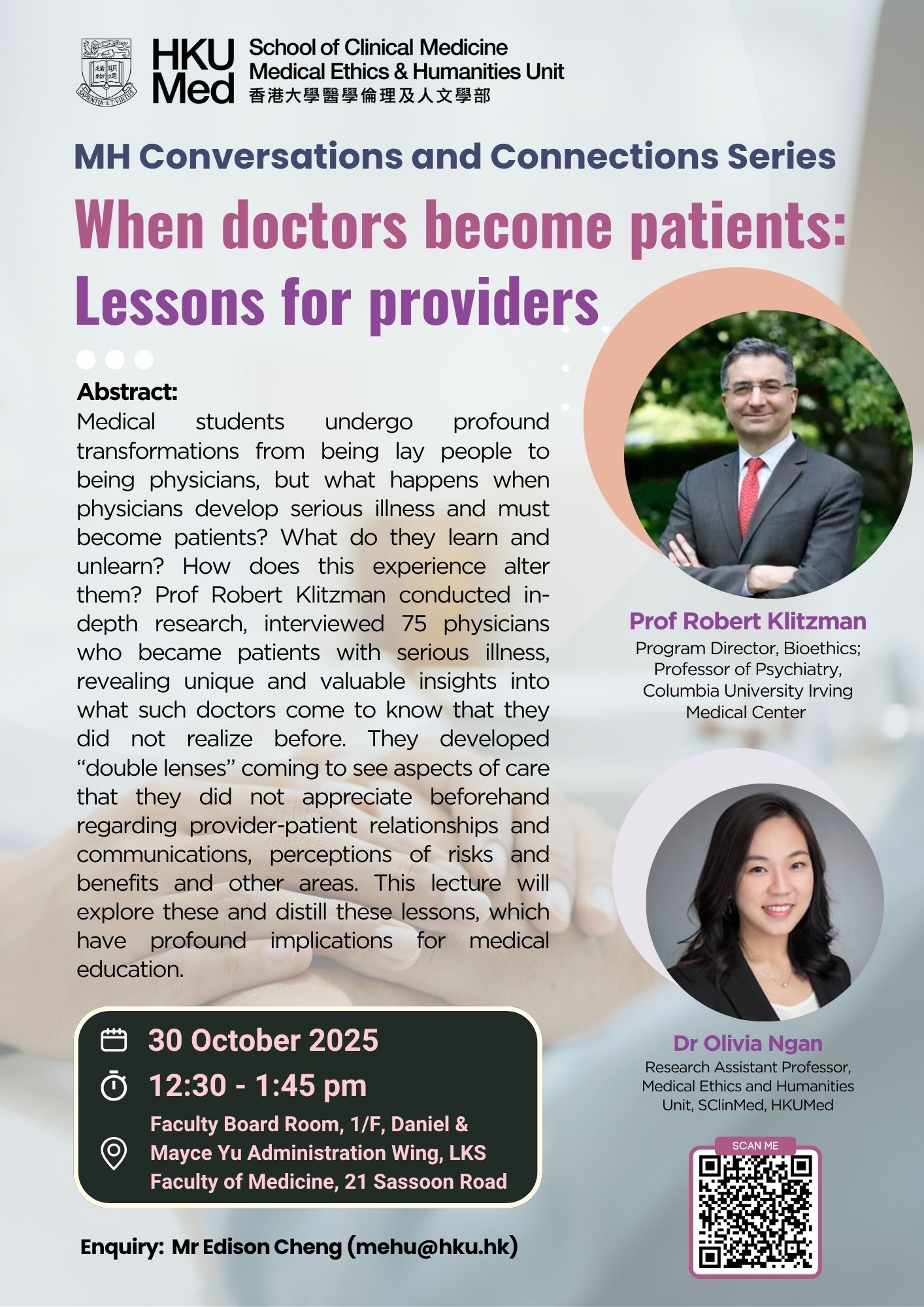 Medical students undergo profound transformations from being lay people to being physicians, but what happens when physicians develop serious illness and must become patients? What do they learn and unlearn? How does this experience alter them? Prof Robert Klitzman conducted in-depth research, interviewed 75 physicians who became patients with serious illness, revealing unique and valuable insights into what such doctors come to know that they did not realize before. They developed “double lenses” coming to see aspects of care that they did not appreciate beforehand regarding provider-patient relationships and communications, perceptions of risks and benefits and other areas. This lecture will explore these and distill these lessons, which have profound implications for medical education.